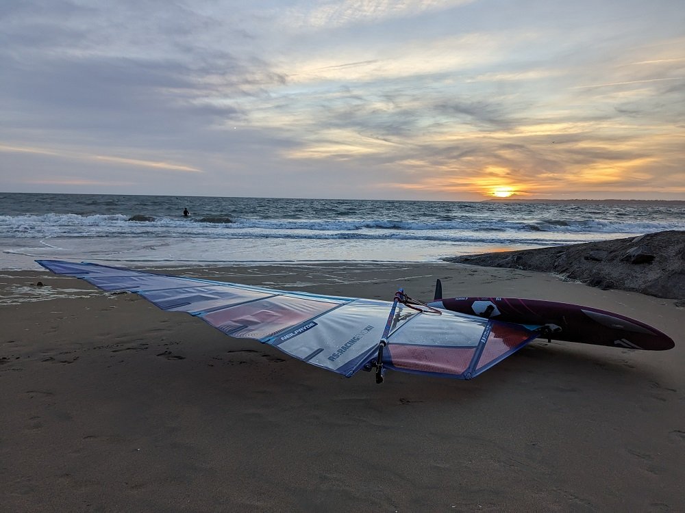 Je regardais les gars en foil s'éclater et puis le vent est arrivé :) Reprise complète des réglages pour passer de plage -- à plage + et c'est parti pour 1h15 taquet. J'ai bien bourriné sur ce plan d'eau peu glissant avec la pleine mer, mais cela m'a fait beaucoup de bien :) Impossible, en revanche d'aller à Saint-brévin car le vent s'est orienté NO. Jibe devant la jetée du port de Comberge ...
