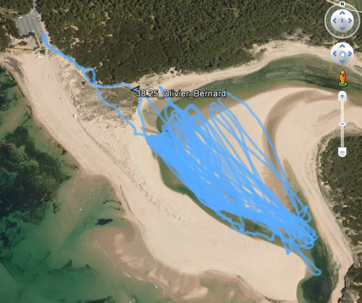 40.8N hier à mi marée. Vent 35N au max, matos JPK proto retaillé 255/47 de début années 90 et Gun méga xs 5.7 2008. Conditions super faciles, glisse au top et retour le long de la dune comme c'était assez carré.