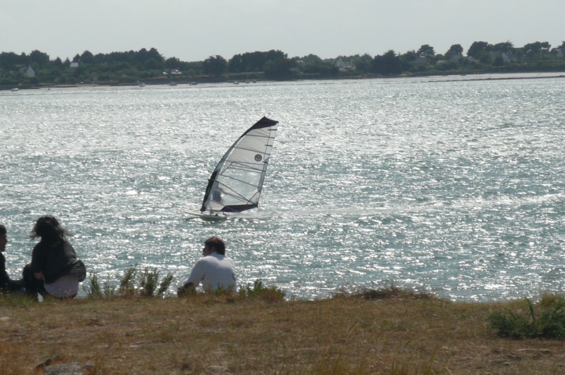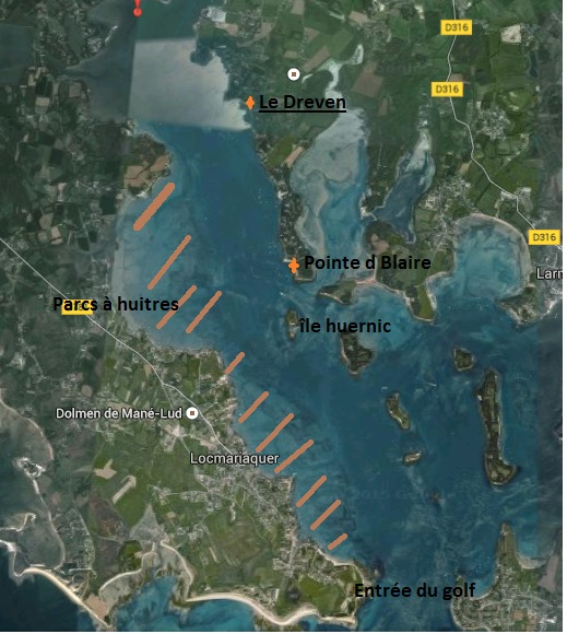 A marée haute => En passant à l’ouest de l’ile d’Huernic (pas assez d’eau à marée basse => parcs à huitre) on peut aller jusqu’à Grégant ou Port Navavlo. Nous sommes donc sous Locmariaquer. Le plan d’eau est vraiment grand et sympa. Aller-retour de 8 milles nautiques.
