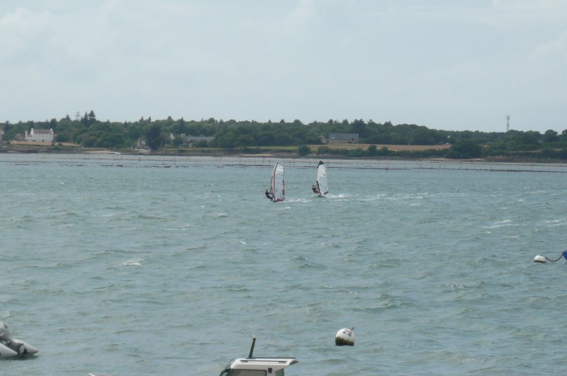 A marée basse => Vers le sud on peut aller jusqu’à l’île Huernic. On navigue dans le chenal donc aucun problème. Sur l’ouest du spot, il y a les parcs à huîtres de Kerouarc’h et Locmariaquer qui découvrent. Plus on s’en approche et plus c’est lisse.
