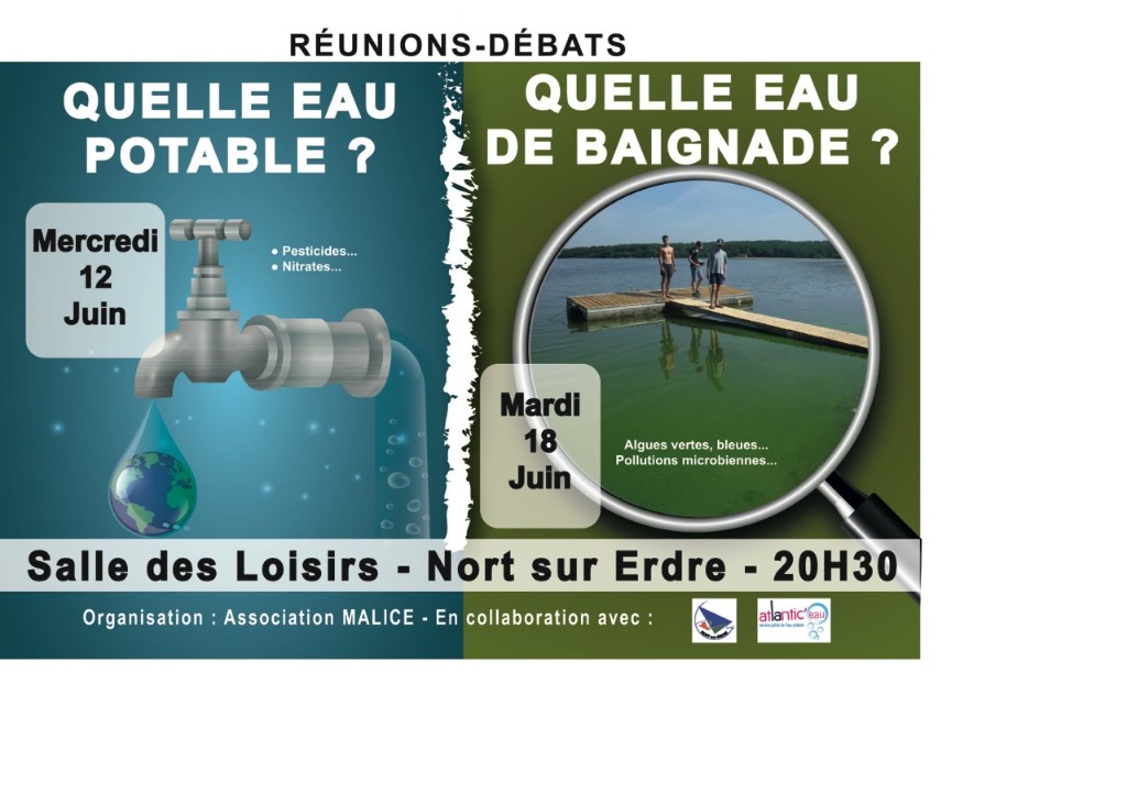 Afin de mieux appréhender le problème, j’organise avec l’association Malice le 18 juin à 20h30 (Nort-sur-Erdre, salle des loisirs) une conférence-débat sur la qualité des eaux de surface sur le bassin de l’Erdre et le réservoir de Vioreau, au regard des pratiques nautiques qui s’y développent (cf. affiche ci-dessous). Sont invités Luc Brient, ingénieur de recherche, spécialiste des cyanobactéries dans l’ouest et un ingénieur d’études sanitaires de L'ARS 44.