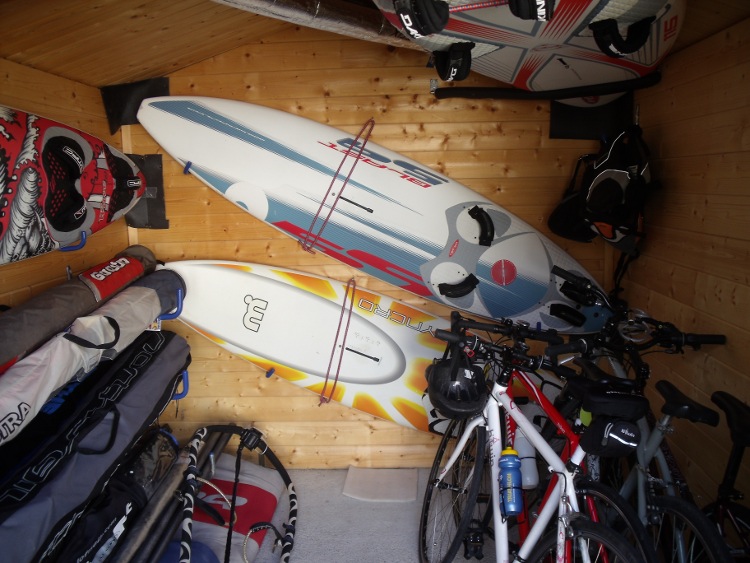 Pour réduire l''emprise au sol du stockage (les flotteurs sont larges , 85 le plus gros ) je stocke les flotteurs sur la tranche deux par deux. Cela réduit les portes à faux , ainsi que le nbre d'équerres. Les flotteurs secs sont dans leur housse fermetures mi ouvertes. Laisser des flotteurs sans protection dans un garage ou on bricole , passe , stocke plein de choses, peut s'avérer dangereux en cas de chute de matériel ...... ça m'est arrivé :-k . C'est fou ce que l'on peut stocker en utilisant des crochets sur les murs ou sous les plafonds. Bosses bien Yoann :wink:.........