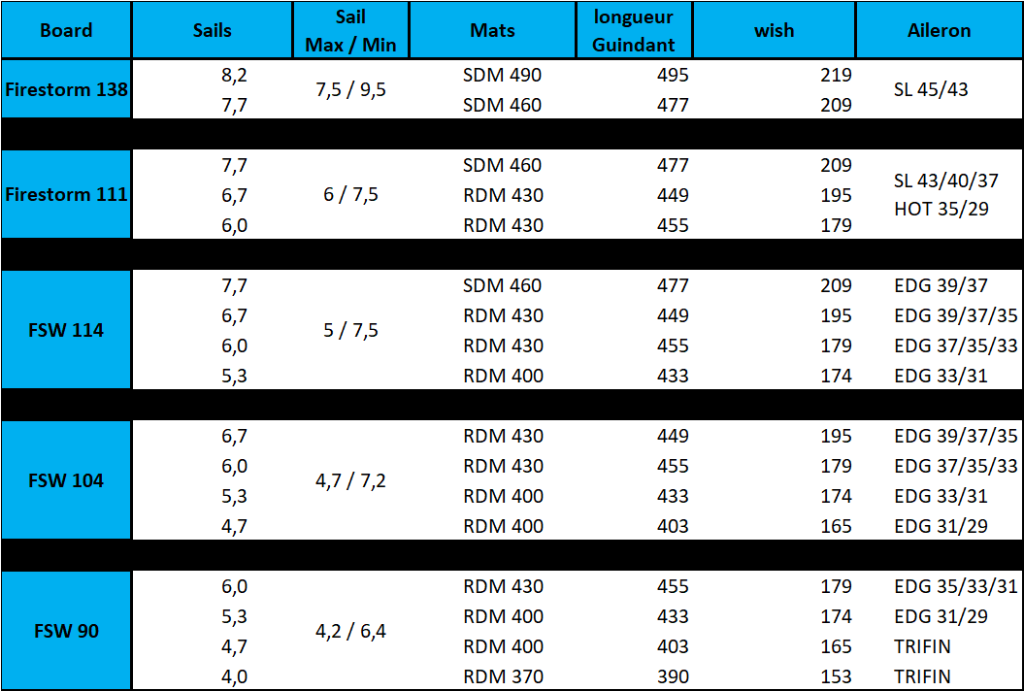 FSW : North Sail ==> Super Session 6 M² / Volt : 5.3 / 4.7 / 4 M², E-Pace 8.2, GA ==> Hybride 7.7 / 6.7