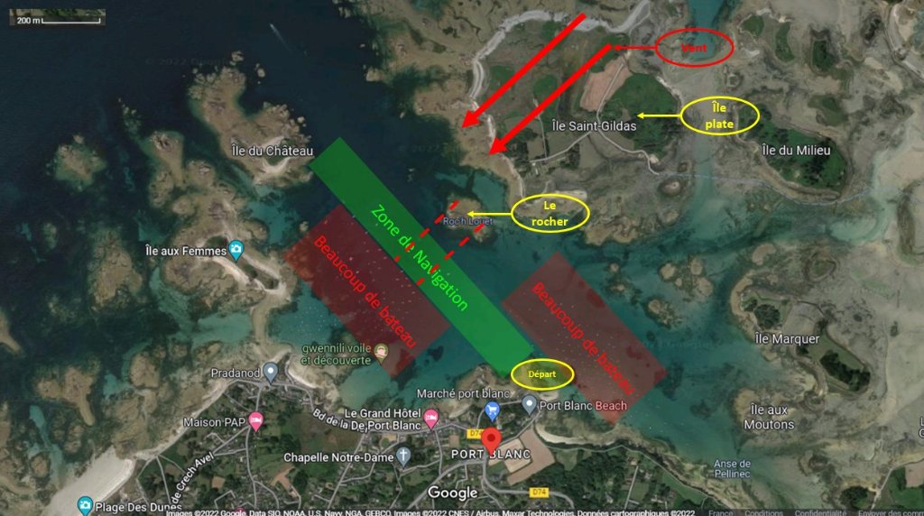 Je fais de la planche dans une baie avec des iles en Bretagne où le vent est malheureusement freiné par le relief (surtout un gros rocher